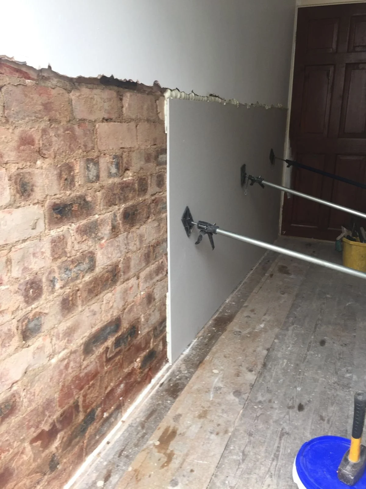 🌬️ Deja respirar el muro varios días después de abrir la ranura y perforar. Observa cómo la humedad va descendiendo gradualmente. No cierres el muro hasta que la mayor parte de la humedad visible haya desaparecido.
